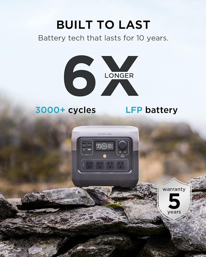 Fully recharge using an AC outlet in only 70 minutes with EcoFlow’s X-Stream fast charging technology. With an output of up to 1600W, run 80% off all your appliances, even high wattage ones. With 11 outlets, from 800W AC outlets to USB-C, simultaneously charge or run all your devices without worrying about overloading. Using LFP battery cells, use and recharge RIVER 2 Pro more than 3000 times before hitting 80%. That’s almost 10 years of regular use. RIVER 2 Pro includes advanced BMS protection, monitoring voltage, current, and temperature to keep your LFP battery running for years. Use clean, green renewable energy to recharge RIVER 2 Pro, in as fast as 3.5 hours with 220W solar input. With a lightweight of only 17.2 lbs, RIVER 2 Pro is the ideal outdoor generator for all your off-grid adventures. With a built-in handle, this portable battery is easy and convenient to take anywhere you need power. RIVER 2 Pro portable power station, AC charging cable, Car charging cable, DC5521 Connection Cable, User manual, and a 5-year service.