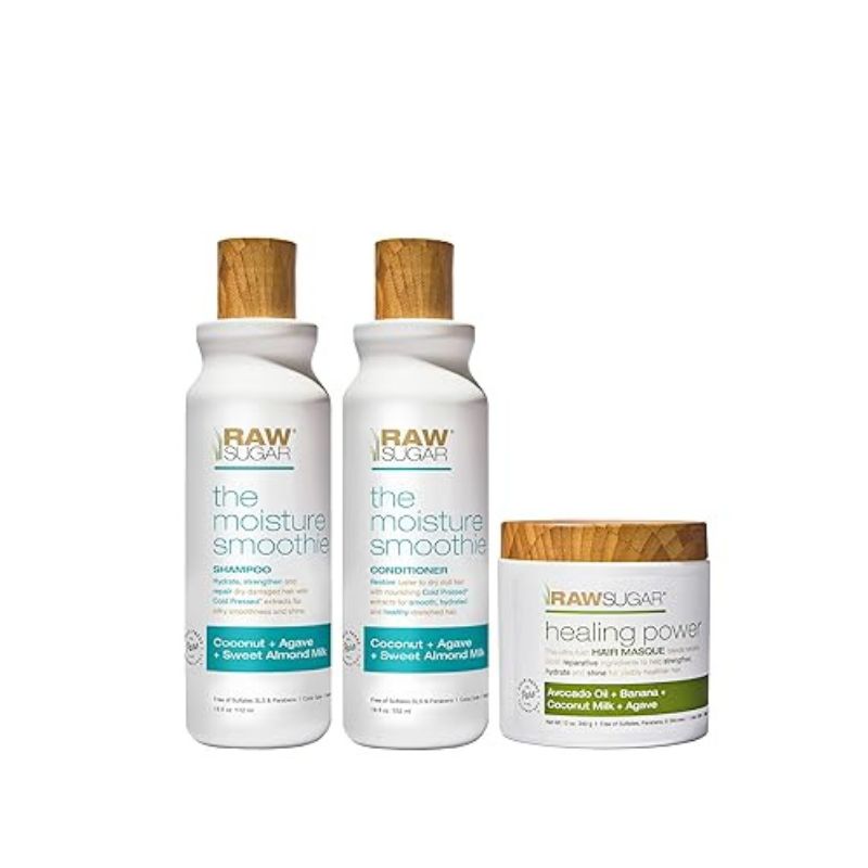 Healing Power Hair Masque, Moisture Smoothie Shampoo and Conditioner bundle. Enjoy an indulgent blend infused with nature’s highly nourishing plant-derived power ingredients to help repair over-worked hair that’s in need of a little love Keep your hair under control with this Moisture Smoothie shampoo that hydrates frizzy, dry locks for a tamed mane. The cold press ingredients in this natural shampoo deliver thirst-quenching nutrients that your hair craves The protein-rich conditioner made with plant-derived & organic ingredients, is vital for dehydrated, frizz-prone hair. This hair care for dry damaged hair is infused with sweet almond oil, coconut & jojoba extracts Treat your hair with the ultimate nourishing power of avocado oil, banana, coconut milk & agave to promote shine & strength. This ultra-lush hydrating hair masque works wonders on all hair types